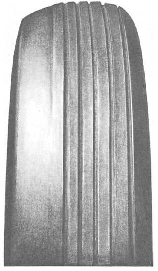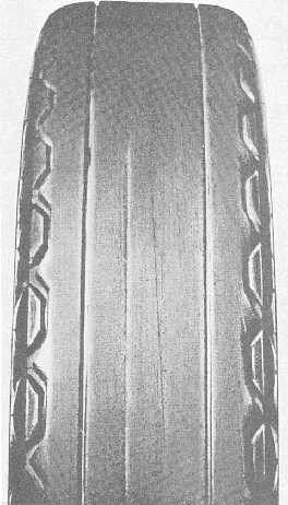 Figure 11-27.Rapid tread wear caused by overinflation. This not only scuffs off the thread, but also causes internal separation of the cords. Always be sure the aircraft is moving before you attempt a turn. This allows the tire to roll instead of scrape. You should make every effort to prevent oil, grease, hydraulic fluid, or other harmful materials from coming in contact with the tires. When there is a chance that harmful materials may come in contact with the tires during maintenance, they should be protected by covers. To clean tires that have come in contact with oil, grease, or other harmful material, you should use a brush or cloth saturated in a soap and water solution. Rinse well with tap water.Uneven Tread Wear If a tire shows signs of uneven or excessive tread wear, the cause should be investigated and the condition remedied before the tire is ruined. Some of the common causes of uneven tread wear are