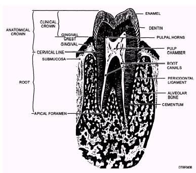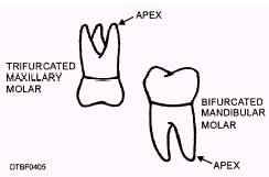 Figure 4-5.-Bifurcated and trifurcated roots. enamel may be attributed to the variation in the thickness, translucent proprieties, and the quality of the crystal structure and surface stains of enamel. Enamel (fig. 4-6) is the calcified substance that covers the entire anatomic crown of the tooth and protects the dentin. It is the hardest tissue in the human body and consists of approximately 96% inorganic minerals, 1% organic materials, and 3% water. Calcium and phosphorus (as hydroxyapatite) are its main inorganic components. Enamel can endure crushing pressure of approximately 100,000 pounds per square inch. A layering of the dentin and periodontium, coupled with the hardness of the enamel, produces a cushioning effect of the tooth's different structures enabling it to endure the pressures of mastication. Structurally, enamel is composed of millions of enamel rods or prisms. Each rod begins at the dentinoenamel junction (junction between the enamel and dentin) and extends to the outer surface of the crown. Enamel is formed by epithelial cells (ameloblasts) that lose their functional ability when the crown of the tooth has been completed. Therefore, enamel, after formation, has no power of further growth or repair. DENTIN Dentin (fig. 4-6) is the light yellow substance that is more radiolucent than enamel and is very porous; it constitutes the largest portion of the tooth. The pulp chamber is located on the internal surface of the dentin walls. Dentin is harder than bone but softer than enamel. Dentin consists of approximately 70% inorganic matter and 30% organic matter and water. Calcium and phosphorus are its chief inorganic components. Dentin is a living tissue and must be protected during operative or prosthetic procedures from dehydration (drying) and thermal shock. The dentin is perforated by tubules (similar to tiny straws) that run between the cementoenamel junction and the pulp. Cell processes from the pulp reach part way into the tubules like fingers. These cell processes create new dentin and mineralize it. Dentin transmits pain stimuli by the way of dentinal fibers. Because dentin is a living tissue, it has the ability for constant growth and repair that reacts to physiologic (functional) and pathologic (disease) stimuli.