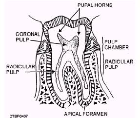Figure 4-7.\Dental pulp. The chief function of the pulp is the formation of dentin. However, it also furnishes nourishment to the dentin; provides sensation to the tooth, and responds to irritation, either by forming reparative secondary dentin or by becoming inflamed. The pulp chamber contains the coronal pulp and pulp horns located within the crown portion of the tooth. The apical foramen is at the end or apex of the radicular pulp. Blood vessels, nerves, and connective tissue pass through this area to reach the interior of the tooth. PERIODONTIUM The tissues that surround and support the teeth are collectively called the periodontium. Their main functions are to support, protect, and provide nourishment to the teeth. Figure 4-8 illustrates the supporting tissues of the periodontium. The periodontium consists of cementum, alveolar process of the maxillae and mandible, periodontal ligament, and gingiva. CEMENTUM Cementum is the only tissue considered as both a basic part of the tooth and a component of the periodontium. It is a thin, calcified layer of tissue that completely covers the dentin of the tooth root. Cementum is forming during the development of the root and throughout the life of the tooth. Cementum functions as an area of attachment for the periodontal ligament fibers. |