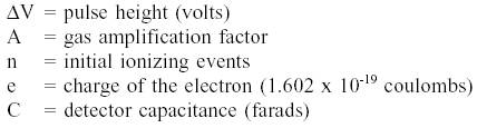 The pulse height can be computed if the capacitance, detector characteristics, and radiation are known. The capacitance is normally about 10-`` farads. The number of ionizing events may be calculated if the detector size and specific ionization, or range of the charged particle, are known. The only variable is the gas amplification factor that is dependent on applied voltage. Summary The operation of gas-filled detectors is summarized below. Gas-Filled Detectors Summary The central electrode, or anode, attracts and collects the electron of the ion-pair. The chamber walls attract and collect the positive ion. When the applied voltage is high enough, the ion pairs initially formed accelerate to a high enough velocity to cause secondary ionizations. The resultant ions cause further ionizations. This multiplication of electrons is called gas amplification.