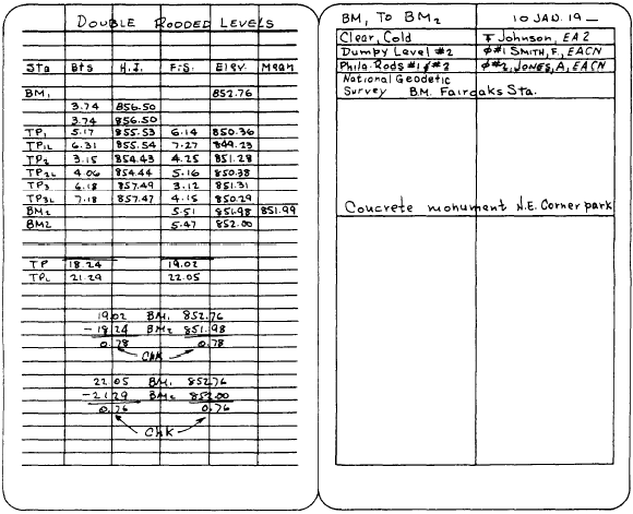 Double Rodding Double rodding is a form of differential leveling in which a continuous check is maintained on the accuracy of the leveling procedure. It is called double rodding because it can be done most conveniently by two rodmen. However, it is possible to carry out the procedure using only one rodman.In double rodding, you determine the HI at each setup point by backlights taken on two different TPs. If no mistake or large error has been made, the result will be two HIs that differ slightly from each other. Elevations computed this way will also differ slightly. In each case, the average is taken as the elevation.Figure 14-21 shows double-rodded level notes for a run from one BM to another by way of three