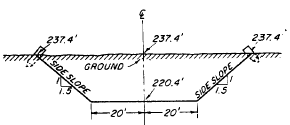 their thicknesses, is given here. However, this design section is a section of the completed highway. For the purpose of staking out and for earthmoving calculations, the cross-section line of the existing ground at each successive station must be plotted; the design data cross section (typical section of the highway) is then superimposed.The cross section of the road, with design data available from a previous design-data survey, is staked out by an EA survey party, preferably the leveling crew. Figure 14-24 shows a designed cross section of a 40-ft-wide road taken from a station or point along the road center line. The elevation of the existing surface is 237.4 ft all the way across; therefore, this is called a level section. Finished grade for the highway at this station that is, the proposed center-line elevation for the finished highway surfaceis 220.4 ft. The prescribed side-slope ratio is 1.5:1; that is; a horizontal unit of 1.5 for every unit of vertical rise.Because the ground line across the cross section is level and the side-slope ratio is the same on both sides, the horizontal distance from the center line to the point where the side slope will meet the natural surface will be the same on both sides. A slope stake is driven at this point to guide the earthmovers. The horizontal distance from the center line to a slope stake can be computed by methods that will be explained later.In the case of this designed cross section, the data available to you are1. the width of the highway, 2. the side-slope ratio, and 3. the proposed finished grade. Besides this, all you need to know to set slope stakes is the ground elevation of the slope-stake point on each side. Because the elevation of the level section in figure 14-24 is the same on both sides, only a single-level shot for elevation is needed. For this reason, a section of this kind is called either a one-level section, or just a level section. Because the entire sectional area consists of material to be excavated or CUT, it is called a section in cut.