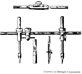 Beam Compass The BEAM COMPASS (fig. 2-21) is used for drawing circles with radii larger than can be set on a pivot joint or bow compass. Both the needle-point attachment and the pen or pencil attachment on a beam compass are slide-mounted on a metal