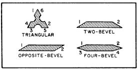 Figure 2-23.-Types of scales in cross section. yellow hardwood. The boxwood scales have white plastic scale faces that are permanently bonded to the boxwood. The graduation lines on the boxwood scales are cut by a highly accurate machine. Plastic scales, while less expensive than boxwood scales, have clear graduations and are reasonably accurate.Scales are generally available in four different shapes, as shown in figure 2-23. The numbers in the figure indicate the location of the scale face. The triangular scale provides six scale faces on one rule. The two-bevel flat scale provides two scale faces on one side of the rule only. The opposite-bevel flat scale provides two scale faces, one on each side of the rule. And the four-bevel flat scale provides four scale faces, two on each side of the rule. The most common types of scales are the architects, the engineers, the mechanical engineers, and the metric. All of these scales are found in the EAs draftsman kit with theexception of the mechanical engineers scale, which is primarily used by machine draftsmen. To gain a better understanding of the architects and engineers scale, which will be described in the following sections, it may be helpful to have the actual scales at hand as you study. |