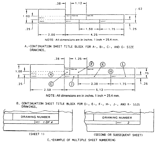 BASIC FORMAT The following discussion deals with the basic drafting format. By basic format, we mean the title block, revision block, list of materials, and other information that must be placed on applicable size drafting sheets. Although you may find slight variations on local-command-prepared drawings, the basic format specified in MIL-HDBK-1006/1 is required on all NAV-FACENGCOM drawings.Title Block The primary purpose of a drawing title block is to identify a drawing. Title blocks must be uniform in size and easy to read. They may be mechanically lettered, neatly lettered freehand, or preprinted commercially on standard size drafting sheets.Generally, the title block is placed in the lower right-hand corner of the drawing sheet, regardless of the size of the drawing (except for vertical title block). There are three sizes of title blocks: a block used for A-, B-, C-, and G-size drawings (fig. 3-15), a slightly larger block for D-, E-, F-, H-, J-, and K-size drawings (fig. 3-16), and a