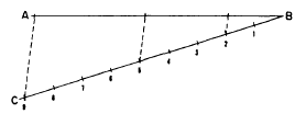Figure 4-9.-Dividing a line into parts according to a given ratio. of doing this is shown in figure 4-9. Here, it is required that AB be divided so that the ratio between AB and a part of AB is the same as the ratio between CD and EF. From A, draw a ray line AG at a convenient acute angle from AB. On AG, lay off AH equal to EF and AI equal to CD. Draw a line from I to B, and use a straightedge and triangle to project H to J on a line parallel to IB. The ratio of AB to AJ is the same as that of CD to EF.ANGLES You already know how to lay off an angle of given size with a protractor, or trigonometrically by the use of the tangent or the chord method. |