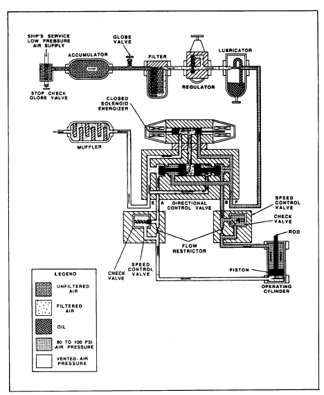 CHAPTER 12 In the preceding chapters, you learned about hydraulic and pneumatic fluids and components of fluid power systems. While having a knowledge of system components is essential, it is difficult to understand the interrelationship of these components by simply watching the system operate. The knowledge of system interrelation is required to effectively troubleshoot and maintain a fluid power system. Diagrams pro-vided in applicable technical publications or drawings are a valuable aid in understanding the operation of the system and in diagnosing the causes of malfunctions.This chapter explains the different types of diagrams used to illustrate fluid power circuits, including some of the symbols that depict fluid power components. Included in this chapter are descriptions and illustrations denoting the differences between open-center and closed-center fluid power systems. The last part of the chapter describes and illustrates some applications of basic fluid power systems.DIAGRAMS As mentioned earlier in this chapter, to troubleshoot fluid power systems intelligently, a mechanic or technician must be familiar with the system on which he or she is working. The mechanic must know the function of each component in the system and have a mental picture of its location in relation to other components. This can best be done by studying the diagrams of the system.A diagram may be defined as a graphic representation of an assembly or system that indicates the various parts and expresses the methods or principles of operations. The ability to read diagrams is a basic requirement for understanding the operation of fluid power systems. Understanding the diagrams of a system requires having a knowledge of the symbols used in the schematic diagrams.SYMBOLS The Navy uses two military standards that list mechanical symbols that must be used in preparing drawings that will contain symbolic representation. These standards are as follows: 1. Military Standard, Mechanical Symbols (Other than Aeronautical, Aerospacecraft, and Spacecraft Use), Part 1, MIL-STD-17B-1. 2. Military Standard, Mechanical Symbols for Aeronautical, Aerospacecraft, and Spacecraft Use, Part 2, MIL-STD-17B-2.Some of the symbols frequently used in fluid power systems have been selected from these two standards and are shown in Appendixes II and III. Appendix II contains symbols from MIL-STD-17B-1. Appendix III contains symbols from MIL-STD-17B-2.While the symbols shown in the appendixes are not all encompassing, they do provide a basis for an individual working with fluid power systems to build upon. Some rules applicable to graphical symbols for fluid diagrams are as follows:1. Symbols show connections, flow paths, and the function of the component represented only. They do not indicate conditions occurring during transition from one flow path to another; nor do they indicate component construction or values, such as pressure or flow rate.2. Symbols do not indicate the location of ports, direction of shifting of spools, or position of control elements on actual components.3. Symbols may be rotated or reversed without altering their meaning except in cases of lines to reservoirs and vented manifolds.4. Symbols may be drawn in any size. 5. Each symbol is drawn to show the normal or neutral condition of each component unless multiple circuit diagrams are furnished showing various phases of circuit operation.For more detailed information concerning the symbols used in fluid power diagrams, consult the above-mentioned military standards. Additional information concerning symbols and the reading of diagrams is contained in BIueprint Reading and Sketching, NAVEDTRA 10077-F1.TYPES OF DIAGRAMS There are many types of diagrams. Those that are most pertinent to fluid power systems are discussed in this text.Pictorial Diagrams Pictorial diagrams (fig. 12-1) show the general location and actual appearance of each component, all interconnecting piping, and the general piping arrangement. This type of diagram is sometimes referred to as an installation diagram. Diagrams of this type are invaluable to maintenance personnel in identifying and locating components of a system.Cutaway Diagrams Cutaway diagrams (fig. 12-2) show the internal working parts of all fluid power components in a system. This includes controls and actuating mechanisms and all interconnecting piping. Cutaway diagrams do not normally use symbols.