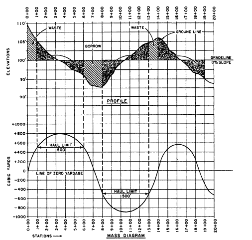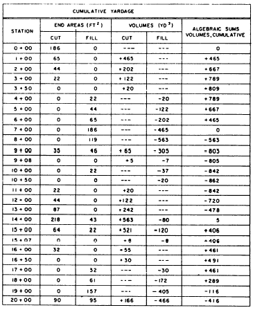 station. As you can see, the mass diagram makes it possible for you to determine by inspection the yardage of cut or fill lying between any pair of stations. Between station 0 + 00 and station 3 + 50, for example, there are about 800 cubic yards of cut. Between station 3 + 50 and station 7 + 00, there are about 800 cubic yards of fill (descending curve). Between station 7 + 00 and station 10 + 50, there are about 850 cubic yards of fill (curve still descending), and so on.