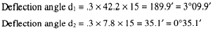 Notice that the deflection angle at the PT is equal to one half of the I angle. That serves as a check of your computations. Had the deflection angle been anything different than one half of the I angle, then a mistake would have been made. Since the total of the deflection angles should be one-half of the I angle, a problem arises when the I angle contains an odd number of minutes and the instrument used is a 1-minute transit. Since the PT is normally staked before the curve is run, the total deflection will be a check on the PC therefore, it should be computed to the nearest 0.5 degree. If the total deflection checks to the nearest minute in the field, it can be considered correct. The curve that was just solved had an I angle of 75 and a degree of curve of 15. When the I angle and degree of curve consists of both degrees and minutes, the procedure in solving the curve does not change; but you must be careful in substituting these values into the formulas for length and deflection angles; for example I = 4215, D = 537. The minutes in each angle must be changed to a decimal part of a degree. To obtain the required accuracy, you should convert them to five decimal places; but an alternate method for computing the length is to convert the I angle and degree of curve to minutes; thus, 4215 = 2,535 minutes and 537 = 337 minutes. Substituting this information into the length formula gives the following: