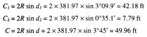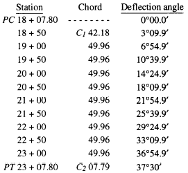 By studying figure 11-10 and remembering that our task is to stake half-station intervals, you can see that the first half station after the PC is Station 18 + 50 and the last half station before the PT is 23+ 00; therefore, the distance from the PC to Station 18 + 00 is 42.2 feet [(18 + 50) - (18 + 07.80)]. Similarly, the distance from Station 23+ 00 to the PT is 7.8 feet. These distances are used to compute the deflection angles for the subchords using the formula for deflection angles (d= .3CD) as follows: