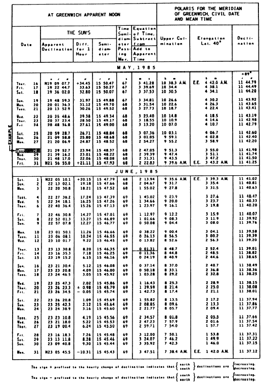 Table 15-4.-Solar Ephemeris for May 1985 Observatory, is shown in table 15-4. The Solar Ephemeris is issued (on request) each year by major engineering instrument makers.Find the suns declination as follows: 1. Accepting the observation as having been made at the meridian, record the local apparent time as 12h.2. Add the longitudinal equivalent time to obtain Greenwich apparent time (GAT).3. Add or subtract the equation of time (true solar time minus local civil time) from GAT to obtain GMT (Greenwich mean time). The equation of time is given in the Solar Ephemeris or Nautical Almanac for the instant of Oh (midnight) daily at Greenwich for the whole year.4. Correct the apparent declination for the date for the elapsed GMT from O".5. In case the local standard time of the observation is recorded, find the GMT at once by simply adding the time zone difference. Then, after all the necessary corrections are made, substitute the value to one of the formulas enumerated above, analyzing carefully to see which formula is appropriate.EXAMPLE: Suppose that on 28 May 1985 in the Northern Hemisphere, you obtained a corrected meridian altitude (h) of the sum of 6737'06" at longitude 8608W. The sun bears south of the observer. The computation to get the corrected declination is as follows: