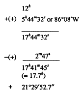Corrected declination 213656.4" From the computation shown above, you see that the declination is positive, so it is a north declination.The transit was pointed south, so this is a case in which the body observed was between the zenith and the equator. This is, then, a Case I situation, in which the latitude equals declination plus zenith distance (90 - 6737'06" or 222254"). Therefore, the latitude is equal to 213656.4" + 222254" or 4359'50.4" |