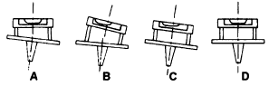 Figure 6-1.Adjusting the level tube. ADJUSTING THE LEVEL TUBE. The vertical axis of rotation of the instrument is the basis for all adjustments to the engineers level. When the instrument is set up and leveled the vertical axis of rotation and the longitudinal axis of the level tube should be perpendicular to one another. If they are not perpendicular, then the vertical axis cannot be made truly vertical. Adjustment of the level tube makes the axis of the level tube perpendicular to the vertical axis. To check and adjust the level tube, you should follow the procedures below:1. Setup the instrument and approximately level the bubble over each pair of opposite leveling screws. Then carefully center the bubble over one pair of screws, as shown in view A, figure 6-1.2. Rotate the instrument 180. If the bubble remains centered, then the level tube is in proper adjustment. If the bubble does NOT remain centered note the movement of the bubble away from center (view B, fig. 6-1). 3. Bring the bubble half the distance back to the center of the tube by turning the capstan nuts at one end of the tube (view C, fig. 6-1).4. Relevel with the leveling screws (view D, fig. 6-1) and rotate the instrument again. Repeat Step 3 above if the bubble does not remain at the center of the tube.5. Check the final adjustment by noting that the bubble remains in the center of the tube during the entire revolution about the vertical axis.NOTE: When the level tube is out of adjustment, you can compensate for it by releveling the instrument before each sighting.ADJUSTING THE HORIZONTAL CROSS HAIR. For the horizontal cross hair to lie in a truly horizontal plane when the instrument is leveled, the horizontal cross hair must be perpendicular to the vertical axis. To make the horizontal cross hair (fig. 6-2) lie in a plane perpendicular to the vertical axis, you should perform the following steps:1. With the instrument carefully leveled, sight one end of the horizontal cross hair on a well-defined point at least 250 feet away. Turn the telescope slowly about the vertical axis, using the slow motion screw. If the cross hairs are in adjustment, the horizontal cross hair will stay on the point through its entire length.2. If it does not stay on the point, loosen two adjacent reticle capstan screws and rotate the reticle by lightly tapping two opposite screws.3. Sight on the point again. If the horizontal cross hair does not stay on the point through its entire length, rotate the ring again.4. Repeat this process until the condition is satisfied.NOTE: To compensate for the above maladjustment, you should use only that part of the horizontal cross hair that is closest to the vertical hair for all sightings.ADJUSTING THE LINE OF SIGHT. For a perfectly adjusted level, the line of sight is parallel to the axis of the level tube. When the level meets this condition, the line of sight will generate a truly horizontal plane when the instrument is rotated. When