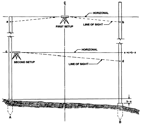 Figure 6-3.Two-peg test method. the line of sight is not parallel to the axis of the level tube, then you must adjust the line of sight. The method used for adjustment is known as the two-peg test (fig. 6-3). This method requires you to do the following steps:1. Setup and level the instrument (first setup, fig. 6-3). Drive stake (peg) A about 150 feet away, then drive stake B at the same distance in the opposite direction.2. Take a rod reading a on stake A and a rod reading b on stake B. With the instrument exactly halfway between the two stakes, b-a is the true difference in elevation between the stakes.3. Move the instrument close to stake A (second setup, fig. 6-3) so that the eyepiece is within a half inch from the rod. Then, by sighting through the objective-lens end of the telescope, take a rod reading c on stake A. Next, take a rod reading d on stake B in the normal manner. If the instrument is in adjustment, d-c will equal b-a.4. If the instrument is out of adjustment, calculate what the correct rod reading e should be on the farther rod B (e = c + b - a). Set the rod reading e with a target for accurate reading. Move the horizontal cross hair to the correct reading (on target) by loosening the correct vertical screw and tightening the opposite screw.5. Check the horizontal cross hair adjustment again. The ring may have rotated during this adjustment.6. Rerun the peg test to check the adjustment. NOTE: The compensation for the above maladjustment is careful balancing of your backlights and foresights. |