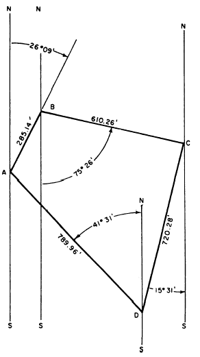 Figure 7-35.Traverse plotted by protractor-and-scale method. Figure 7-35 shows the method of how to plot this traverse with a scale and protractor. First select a scale that will make the plot fit on the size of your paper. Select a convenient point on the paper for stations A and draw a light line NS, representing the meridian through the station.AB bears N269'E. Set the protractor with the central hole on A and the 00 line at NS, and lay off 2609'E. You will have to estimate the minutes as best you can. Draw a line in this direction from A, and on the line measure off the length of AB (285. 14 feet) to scale. This locates station B on the plot. Draw a light line NS through B parallel to NS through A, and representing the meridian through station B. BC bears S7526'E. Set the protractor with the central hole on B and the 00 line on NS, lay off 7526' from the S leg of NS to the E, and measure off the length of BC (610.26 feet) to scale to