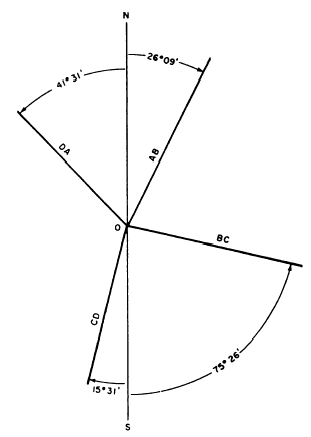 Figure 7-36.Plotting traverse lines by parallel method from a single meridian.locate C. Proceed to locate D in the same manner. This procedure leaves you with a number of light meridian lines through stations on the plot. A procedure that eliminates these lines is shown in figure 7-36. Here you draw a single meridian NS, well clear of the area of the paper on which you intend to plot the traverse. From a convenient point O, you layoff each of the traverse lines in the proper direction. You can then transfer these directions to the plot by one of the methods for drawing parallel lines.PLOTTING ANGLES FROM TANGENTS. Sometimes instead of having bearing angles to plot from, you might want to plot the traverse from deflection angles turned in the field. The deflection angles for the traverse you are working on are as follows:AB to BC 7825'RBC to CD 9057'RCD to DA 12258'RDA to AB 6740'R