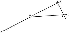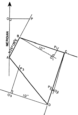 Figure 7-37.Plotting by tangent-offset method from deflection angles larger than 45.You could plot from these angles by protractor. Lay off one of the traverse lines to scale; then lay off the direction of the next line by turning the deflection angle to the right of the firt line extension by protractor and soon. However, the fact that you can read a protractor directly to only the nearest 30 minutes presents a problem. When you plot from bearings, your error in estimation of minutes applies only to a single traverse line. When you plot from deflection angles, however, the error carries on cumulatively all the way around. For this reason, you should use the tangent method when you are plotting deflection angles.Figure 7-37 shows the procedure of plotting deflection angles larger than 45. The direction of the starting line is called the meridian, following a conventional procedure, that the north side of the figure being plotted is situated toward the top of the drawing paper. In doing this, you might have to plot the appropriate traverse to a small scale using a protractor and an engineers scale, just to have a general idea of where to start. Make sure that the figure will fit proportionately on the paper of the desired size. Starting at point A, you draw the meridian line lightly. Then you lay off AO, 10 inches (or any convenient round-figure length) along the referenced meridian. Now, from O you draw a line OP perpendicular to AO. Draw a light line OP as shown. In a trigonometric table, look for the natural tangent of the bearing angle 2690', which equals to 0.49098. Find the distance OP as follows:OP = AO tan 2609' = 4.9098, or 4.91 inches.You know that OP is equal to 4.91 inches. Draw AP extended; then you lay off the distance AB to scale along AP. Remember that unless you are plotting a closed traverse, it is always advantageous to start your offsets from the referenced meridian. The reason is that, after you have plotted three or more lines, you can always use this referenced meridian line for checking the bearing of the last line plotted to find any discrepancy. The bearing angle, used as a check should also be found by the same method (tangent-offset method).Now to plot the directions of lines from deflection angles larger than 45, you have to use the complementary angle (90 minus the deflection angle). To plot the direction of line BC in figure 7-37, draw a light perpendicular line towards the right from point B. Measure off again a convenient round-figured length, say 10 inches, representing BOBOThe complement of the deflection angle of BC is 90 7825' = 1135'. The natural tangent value of 1135 is equal to 0.20497. From O1 draw OIP1 perpendicular to BOI Solving for OIPl, you will haveO1P1 = BO2 tan 1135' = 2.0497, or 2.05 inches. Now lay off the distance O1P2 Draw a line from B through P1 extended; lay off the distance BC to scale along this line. The remaining sides, CD and DA, are plotted the same way. Make sure that the angles used for your computations are the correct ones. A rough sketch of your next line will always help to avoid major mistakes. When the deflection angle is less than 45, the procedure of plotting by tangent is as shown in figure 7-38. Here you measure off a convenient round-figure length (say 500.00 feet) on the extension of the initial traverse line to locate point O, and from O, draw OP perpendicular to AO. The angle between BO and BC is,