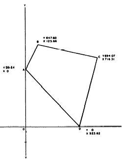 Figure 7-39.Plotting by coordnates. in this case, the deflection angle. Assume that 2321'. The formula for the length of OP is this is OP = BO tan 2321' = 500 x 0.43170= 215.85 feet. |