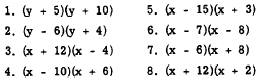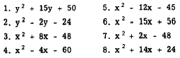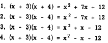 It is apparent that trinomials like these may be factored into binomials as shown. Notice how the trinomial in each of the preceding examples is formed. The first term is the square of the common term of the binomial factors. The second term is the algebraic sum of their unlike terms times their common term. The third term is the product of their unlike terms,Such trinomials may be factored as the product of two binomials if there are two numbers such that their algebraic sum is the coefficient of the middle term and their product is the last term.For example, let us factor the expression x2 - 12x + 32. If the expression is factorable, there will be a common term, x, in each of the binomial factors. We begin factoring by placing this term within each set of parentheses, as follows:(x )(x ) Next, we must find the other terms that are to go in the parentheses. They will be two numbers such that their algebraic sum is -12 and satisfy the conditions. Thus, the following expression results :X2 - 12x + 32 = (x - 8)(x - 4)It is of value in factoring to note some useful facts about trinomials. If both the second and third terms of the trinomial are positive, the signs of the terms to be found are positive as in example 1 of this section. If the second term is negative and the last is positive, both terms to be found will be negative as in example 2. If the third term of the trinomial is negative, one of the terms to be found is positive and the other is negative as in examples 3 and 4. Concerning this last case, if the second term is positive as in example 3, the positive term in the factors has the greater numerical value. If the second term is negative as in example 4, the negative term in the factors has the greater numerical value.It should be remembered that not all trinomials are factorable. For example, x2 + 4x + 2 cannot be factored since there are no two rational numbers whose product is 2 and whose sum is 4.Practice problems. Factor completely, in the following problems: