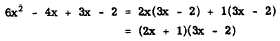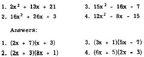 Thus far we have considered only those expressions in which the coefficient of the first term is 1. When the coefficient of the first term is other than 1, the expression can be factored as shown in the following example:6x2 - x - 2 = (2x + 1)(3x - 2) Although this result can be obtained by the trial and error method, the following procedure saves time and effort. First, find two numbers whose sum is the coefficient of the second term (-1 in this example) and whose product is equal to the product of the third term and the coefficient of the first term (in this example, (6)(-2) or -12). By inspection, the desired numbers are found to be -4 and +3. Using these two numbers as coefficients for x, we can rewrite the original expression as 6x2 - 4x + 3x - 2 and factor as follows: