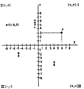 Figure 12-1 -Rectangular coordinate system. Point P (fig. 12-1) is 6 units to the right of the Y axis and 3 units above the X axis. We call the numbers that indicate the position of a point COORDINATES. The number indicating the distance of the point measured horizontally from the origin is the X coordinate (6 in this example), and the number indicating the distance of the point measured vertically from the origin (3 in this example) is the Y coordinate. In describing the location of a point by means of rectangular coordinates, it is customary to place the coordinates within parentheses and separate them with a comma. The X coordinate is always written first. The coordinates of point P (fig. 12-1) are written (6, 3). The coordinates for point Q are (4, -5); for point R, they are (-5, -2); and for point S, they are (-8, 5). Usually when we indicate a point on a graph, we write a letter and the coordinates of the point. Thus, in figure 12-1, for point S, we write S(-8, 5). The other points would ordinarily be written, P(6, 3), Q(4, -5), and R(-5, -2). The Y coordinate of a point is often called its ORDINATE and the X coordinate is often called its ABSCISSA. QUADRANTS The X and Y axes divide the graph into four parts called QUADRANTS. In figure 12-1, point P is in quadrant I, point S is in quadrant II, R is in quadrant III, and Q is in quadrant IV. In the first and fourth quadrants, the X coordinate is positive, because it is to the right of the origin. In the second and third quadrant it is negative, because it is to the left of the origin. Likewise, the Y coordinate is positive in the first and second quadrants, being above the origin; it is negative in the third and fourth quadrants, being below the origin. Thus, we know in advance the signs of the coordinates of a point by knowing the quadrant in which the point appears. The signs of the coordinates in the four quadrants are shown in figure 12-1. Locating points with respect to axes is called PLOTTING. As shown with point P (fig. 12-l), plotting a point is equivalent to completing a rectangle that has segments of the axes as two of its sides with lines dropped perpendicularly to the axes forming the other two sides. This is the reason for the name "rectangular coordinates." PLOTTING A LINEAR EQUATION A linear equation in two variables may have many solutions. For example, in solving the equation 2x - y = 5, we can find an unlimited number of values of x for which there will be a corresponding value of y. When x is 4, y is 3, since (2 x 4) - 3 = 5. When x is 3, y is 1, and when x is 6, y is 7. When we graph an equation, these pairs of values are considered coordinates of points on the graph. The graph of an equation is nothing more than a line joining the points located by the various pairs of numbers that satisfy the equation. To picture an equation, we first find several pairs of values that satisfy the equation. For example, for the equation 2x - y = 5, we assign several values to x and solve for y. A convenient way to find values is to first solve the equation for either variable, as follows: