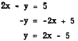 Figure 12-2.-Graph of 2x - y = 5. Finally, we draw a line joining these points, as in figure 12-2 (B). It is seen that this is a straight line; hence the name "linear equation." Once the graph is drawn, it is customary to write the equation it represents along the line, as shown in figure 12-2 (B). It can be shown that the graph of an equation is the geometric representation of all the points whose coordinates satisfy the conditions of the equation. The line represents an infinite number of pairs of coordinates for this equation. For example, selecting at random the point on the line where x is 2: and y is 0 and substituting these values in the equation, we find that they satisfy it. Thus,
