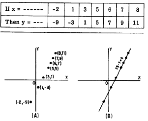 Once this is accomplished, the value of y is readily apparent when values are substituted for x. The information derived may be recorded in a table such as table 12-1. We then lay off X and Y axes on graph paper, select some convenient unit distance for measurement along the axes, and then plot the pairs of values found for x and y as coordinates of points on the graph. Thus, we locate the pairs of values shown in table 12-1 on a graph, as shown in figure 12-2 (A). Table 12-1.-Values of x and y in the equation