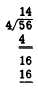 The thought process is as follows: "4 is contained in 5 once" (write 1 in tens place over the 5); "one times 4 is 4" (write 4 in tens place under 5, take the difference, and bring down 6); and "4 is contained in 16 four times" (write 4 in units place over the 6). After a little practice, many people can do the work shown under the dividend mentally and write only the quotient, if the divisor has only 1 digit. The divisor is sometimes too large to be contained in the first digit of the dividend. The following example illustrates a problem of this kind: