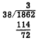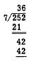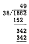 Since 2 is not large enough to contain 7, we divide 7 into the number formed by the first two digits, 25. Seven is contained 3 times in 25; we write 3 above the 5 of the dividend. Multiplying, 3 times 7 is 21; we write 21 below the first two digits of the dividend. Subtracting, 25 minus 21 is 4; we write down the 4 and bring down the 2 in the units place of the dividend. We have now formed a new dividend, 42. Seven is contained 6 times in 42; we write 6 above the 2 of the dividend. Multiplying as before, 6 times 7 is 42; we write this product below the dividend 42. Subtracting, we have nothing left and the division is complete. Estimation When there are two or more digits in the divisor, it is not always easy to determine the first digit of the quotient. An estimate must be made, and the resulting trial quotient may be too large or too small. For example, if 1,862 is to be divided by 38, we might estimate that 38 is contained 5 times in 186 and the first digit of our trial divisor would be 5. However, multiplication reveals that the product of 5 and 38 is larger than 186. Thus we would change the 5 in our quotient to 4, and the problem would then appear as follows: