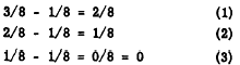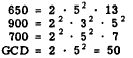 We see that l/8 can be subtracted from 3/8 three times. Therefore,3/8 1/8 = 3 When the denominators of fractions are unequal, the fractions are said to be unlike. Addition, subtraction, or division cannot be performed directly on unlike fractions. The proper application of the fundamental rule, however, can change their form so that they become like fractions; then all the rules for like fractions apply.LOWEST COMMON DENOMINATOR To change unlike fractions to like fractions, it is necessary to find a COMMON DENOMINATOR and it is usually advantageous to find the LOWEST COMMON DENOMINATOR (L C D). This is nothing more than the least common multiple of the denominators.Least Common Multiple If a number is a multiple of two or more different numbers, it is called a COMMON MULTIPLE. Thus, 24 is a common multiple of 6 and 2. There are many common multiples of these numbers. The numbers 36, 48, and 54, to name a few, are also common multiples of 6 and 2.The smallest of the common multiples of a set of numbers is called the LEAST COMMON MULTIPLE. It is abbreviated LCM. The least common multiple of 6 and 2 is 6. To find the least common multiple of a set of numbers, first separate each of the numbers into prime factors.Suppose that we wish to find the LCM of 14, 24, and 30. Separating these numbers into prime factors we have14 =2 x 7 The LCM will contain each of the various prime factors shown. Each prime factor is used the greatest number of times that it occurs in any one of the numbers. Notice that 3, 5, and 7 each occur only once in any one number. On the other hand, 2 occurs three times in one number.We get the following result: LCM = 23 x 3 x 5 x 7 Thus, 840 is the least common multiple of 14, 24, and 30.Greatest Common Divisor The largest number that can be divided into each of two or more given numbers without a remainder is called the GREATEST COMMON DIVISOR of the given numbers. It is abbreviated GCD. It is also sometimes called the HIGHEST COMMON FACTOR.In finding the GCD of a set of numbers, separate the numbers into prime factors just as for LCM. The GCD is the product of only those factors that appear in all of the numbers. Notice in the example of the previous section that 2 is the greatest common divisor of 14, 24, and 30. Find the GCD of 650,900, and 700. The procedure is as follows: