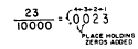 CHAPTER 5 DECIMALS The origin and meaning of the word "decimal" were discussed in chapter 1 of this course. Also discussed in chapter 1 were the concept of place value and the use of the number ten as the base for our number system. Another term which is frequently used to denote the base of a number system is RADIX. .For example, two is the radix of the binary system and ten is the radix of the decimal system. The radix of a number system is always equal to the number of different digits used in the system. For example, the decimal system, with radix ten, has ten digits: 0 through 9.DECIMAL FRACTIONS A decimal fraction is a fraction whose denominator is 10 or some power of 10, such as 100, 1,000, or 10,000. Thus, 7/10 13/100 and 215 /1000 are decimal fractions. Decimal fractions have special characteristics that make computation much simpler than with other fractions.Decimal fractions complete our decimal system of numbers. In the study of whole numbers, we found that we could proceed to the left from the units place, tens, hundreds, thousands, and on indefinitely to any larger place value, but the development stopped with the units place. Decimal fractions complete the development so that we can proceed to the right of the units place to any smaller number indefinitely. Figure 5-l (A) shows how decimal fractions complete the system. It should be noted that as we proceed from left to right, the value of each place is one-tenth the value of the preceding place, and that the system continues uninterrupted with the decimal fractions. Figure 5-l (B) shows the system again, this time using numbers. Notice in (A) and (B) that the units place is the center of the system and that the place values proceed to the right or left of it by powers of ten. Ten on the left is balanced by tenths on the right, hundred6 by hundredths, thousands by thousandths, etc. Notice that l/10 is one place to the right of the units digit, 1/100 is two places to the right, etc. (See fig. 5-l.) If a marker is placed after the units digit, we can decide whether a decimal digit is in the tenths, hundredths, or thousandths position by counting places to the right of the marker. In some European countries, the marker is a comma; but in the English-speaking countries, the marker is the DECIMAL POINT.Thus, 3/10 is written 0.3. To write 3/100 is necessary to show that 3 is in the second place to the right of the decimal point, so a zero is inserted in the first place. Thus, 3/100 is written Similarly, 3/1000. can be written by inserting zeros in the first two places to the right of the decimal point. Thus, 3/1000 is written 0.003. In the number 0.3, we say that 3 is in the first decimal place; in 0.03, 3 is in the second decimal place; and in 0.003, 3 is in the third decimal place. Quite frequently decimal fraction6 are simply called decimals when written in this shortened form.WRITING DECIMALS Any decimal fraction may be written in the shortened form by a simple mechanical process. Simply begin at the right-hand digit of the numerator and count off to the left as many places as there are zeros in the denominator. Place the decimal point to the left of the last digit counted. The denominator may then be disregarded. If there are not enough digits, as many place-holding zero6 as are necessary are added to the left of the left-hand digit in the numerator.Thus, is 23/10000 beginning with the digit 3, we count off four places to the left, adding two Os as we count, and place the decimal point to the extreme left. (See fig. 5-2.) Either form is read "twenty-three ten-thousandths." When a decimal fraction is written in the shortened form, there will always be as many decimal places in the shortened form as there