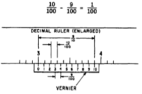 VERNIER Sometimes the marking on the thimble of the micrometer does not fall directly on the index line of the sleeve. To make possible readings even smaller than thousandths, an ingenious device is introduced in the form of an additional scale. This scale, called a VERNIER, was named after its inventor, Pierre Vernier. The vernier makes possible accurate readings to the ten-thousandth of an inch.Principle of the Vernier Suppose a ruler has markings every tenth of an inch but it is desired to read accurately to hundredths. A separate scale (fig. 6-3) is added to the ruler. It has 10 markings on it that take up the same distance as 9 markings on the ruler scale. Thus, each space on the vernier is 1/10 of 9/10 inch, or 9/100 inch. How much smaller is a space on the vernier than a space on the ruler? The ruler space is 1/10 inch, or 10/100 and the vernier space is 9/100 inch. The vernier space is smaller by the difference between these two numbers, as follows: