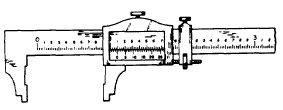 Figure 6-5.A vernier caliper. Vernier Micrometer By adding a vernier to the micrometer, it is possible to read accurately to one ten-thousandth of an inch. The vernier markings are on the sleeve of the micrometer and are parallel to the thimble markings. There are 10 divisions on the vernier that occupy the same space as 9 divisions on the thimble. Since a thimble space is one thousandth of an inch, a vernier space is 1/10 of 9/1000 inch, or 9/10000 inch. It is 1/10000 inch less than a thimble space. Thus, as in the preceding explanation of verniers, it is possible to read the nearest ten-thousandth of an inch by reading the vernier digit whose marking coincides with a thimble marking.In figure 6-6 (A), the last major division showing fully on the sleeve index is 3. The third minor division is the last mark clearly showing (0.075). The thimble division nearest and below the index is the 8 (0.008). The vernier marking that matches a thimble marking is the fourth (0.0004). Adding them all together, we have,