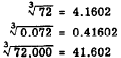 Cube Root The fifth column in appendix I shows that the cube root of 72 is 4.1602. By shifting the decimal point we immediately have the cube roots of certain other numbers involving the same digits. A shift of three places in the decimal point in the radicand corresponds to a shift of one place in the same direction in the cube root.Compare the following examples: