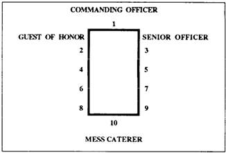 SETTING FOR BUFFET SERVICE Buffet service was briefly described earlier in this chapter. However, there are unique sanitary considerations involved in the setup and operation of buffet- or cafeteria-style serving lines. Open serving pans and trays provide ideal sites for growth and spread of disease-carrying organisms. Following a few simple rules can reduce the chance of infection. 1. Always keep hot foods at temperatures above 140F, Discard the food within 4 hours of the beginning of preparation if these temperatures cannot be maintained. 2. Display only limited amounts of food on the serving line at any one time. This permits the balance of food to be kept in the pantry for temperature control. Refill serving pans and trays only as necessary. 3. Finally, use a sneeze shield whenever possible. The principal tasks involved in setting up the buffet serving line are presented next. The serving line setup tasks should be done in the order listed and completed 5 minutes before serving time. 1. Make space for the buffet serving line. A buffet table should be located to allow MSs convenient access to the pantry for filling the serving pans. This also allows the diners to use the serving line easily without crowding from furniture or other diners. 2. Place the linen on a special buffet table or a selected area on the sideboard. Remove all nonessential items on the sideboard area when used to setup a buffet serving area. 3. Set up the chafing dish stands. Setup enough stands so there is at least one for each food item. Place them in the serving area so a diner can have ready access to them without leaning over the table. After the chafing dish pans have been set in place, put 1 inch of water into those pans that are for hot food. Sterno heating units are then placed below the center of the pans containing water. Make sure there are no flammable items placed near these units as the setup continues. Do not light the heating units at this point. 4. Place the sneeze shield now, if one is available. Do this in a way to make sure all food items are properly protected. Diners should still have ready access to the foods. 5. Determine what utensils will be needed. Then place all necessary eating utensils neatly at the beginning of the serving line. Napkins and silverware are usually placed on the dining tables. However, when there are more diners than seats, additional place settings should be kept on the sideboard. They should be placed on the dining tables after diners finish and leave, making room for additional diners. There are not always enough MSs to do the resetting. On these occasions, napkins and silverware should be placed on the serving line. They should be placed next to the china and away from the chafing dishes. 6. Set the decorations selected by the wardroom supervisor on the serving table. Decorations are usually artificial or real flowers arranged around the three sides of the serving area facing the diner. SEATING ARRANGEMENTS In the wardroom where regulations and precedence closely control seating arrangements, officers are assigned to permanent seats for daily meals. They are seated from left to right, as shown in i r - according to rank and precedence.