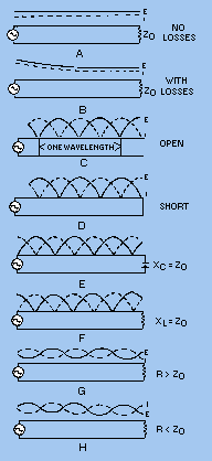 STANDING WAVES ON A TRANSMISSION LINE There is a large variety of terminations for rf lines. Each type of termination has a characteristic effect on the standing waves on the line. From the nature of the standing waves, you can determine the type of termination that produces the waves. TERMINATION IN Z0 Termination in Z0 (characteristic impedance) will cause a constant reading on an ac meter when it is moved along the length of the line. As illustrated in figure 3-34, view A, the curve, provided there are no losses in the line, will be a straight line. If there are losses in the line, the amplitude of the voltage and current will diminish as they move down the line (view B). The losses are due to dc resistance in the line itself. Figure 3-34. - Effects of various terminations on standing waves.