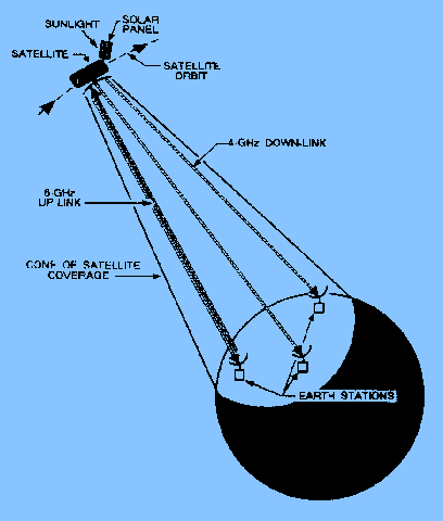 INTRODUCTION If you had been around in the early days of electronics, you would have considered an ANTENNA (AERIAL) to be little more than a piece of wire strung between two trees or upright poles. In those days, technicians assumed that longer antennas automatically provided better reception than shorter antennas. They also believed that a mysterious MEDIUM filled all space, and that an antenna used this medium to send and receive its energy. These two assumptions have since been discarded. Modern antennas have evolved to the point that highly directional, specially designed antennas are used to relay worldwide communications in space through the use of satellites and Earth station antennas (fig. 4-1). Present transmission theories are based on the assumption that space itself is the only medium necessary to propagate (transmit) radio energy. Figure 4-1. - Satellite/earth station communications system. A tremendous amount of knowledge and information has been gained about the design of antennas and radio-wave propagation. Still, many old-time technicians will tell you that when it comes to designing the length of an antenna, the best procedure is to perform all calculations and try out the antenna. If it doesn't work right, use a cut-and-try method until it does. Fortunately, enough information has been collected over the last few decades that it is now possible to predict the behavior of antennas. This chapter will discuss and explain the basic design and operation of antennas. PRINCIPLES OF ANTENNA RADIATION After an rf signal has been generated in a transmitter, some means must be used to radiate this signal through space to a receiver. The device that does this job is the antenna. The transmitter signal energy is sent into space by a TRANSMITTING ANTENNA; the rf signal is then picked up from space by a RECEIVING ANTENNA. The rf energy is transmitted into space in the form of an electromagnetic field. As the traveling electromagnetic field arrives at the receiving antenna, a voltage is induced into the antenna (a conductor). The rf voltages induced into the receiving antenna are then passed into the receiver and converted back into the transmitted rf information. The design of the antenna system is very important in a transmitting station. The antenna must be able to radiate efficiently so the power supplied by the transmitter is not wasted. An efficient transmitting antenna must have exact dimensions. The dimensions are determined by the transmitting frequencies. The dimensions of the receiving antenna are not critical for relatively low radio frequencies. However, as the frequency of the signal being received increases, the design and installation of the receiving antenna become more critical. An example of this is a television receiving antenna. If you raise it a few more inches from the ground or give a slight turn in direction, you can change a snowy blur into a clear picture. The conventional antenna is a conductor, or system of conductors, that radiates or intercepts electromagnetic wave energy. An ideal antenna has a definite length and a uniform diameter, and is completely isolated in space. However, this ideal antenna is not realistic. Many factors make the design of an antenna for a communications system a more complex problem than you would expect. These factors include the height of the radiator above the earth, the conductivity of the earth below it, and the shape and dimensions of the antenna. All of these factors affect the radiated-field pattern of the antenna in space. Another problem in antenna design is that the radiation pattern of the antenna must be directed between certain angles in a horizontal or vertical plane, or both. Most practical transmitting antennas are divided into two basic classifications, HERTZ (half-wave) ANTENNAS and MARCONI (quarter-wave) ANTENNAS. Hertz antennas are generally installed some distance above the ground and are positioned to radiate either vertically or horizontally. Marconi antennas operate with one end grounded and are mounted perpendicular to the Earth or to a surface acting as a ground. Hertz antennas are generally used for frequencies above 2 megahertz. Marconi antennas are used for frequencies below 2 megahertz and may be used at higher frequencies in certain applications. A complete antenna system consists of three parts: (1) The COUPLING DEVICE, (2) the FEEDER, and (3) the ANTENNA, as shown in figure 4-2. The coupling device (coupling coil) connects the transmitter to the feeder. The feeder is a transmission line that carries energy to the antenna. The antenna radiates this energy into space. Figure 4-2. - Typical antenna system.