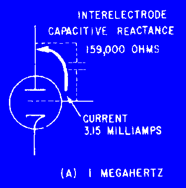 MICROWAVE COMPONENTS The waveguides discussed in chapter 1 serve to transport microwave energy from one place to another. Energy is transported after it has been generated or amplified in a previous stage of the circuit. In this chapter you will be introduced to the special components used in those circuits. Microwave energy is used in both radar and communications applications. The fact that the frequencies are very high and the wavelengths very short presents special problems in circuit design. Components that were previously satisfactory for signal generation and amplification use are no longer useful in the microwave region. The theory of operation for these components is discussed in this chapter. Because the theory of operation is sometimes difficult to understand, you need to pay particular attention to detail as you study this chapter. It is written in the simplest manner possible while retaining the necessary technical complexity. The efficiency of conventional tubes is largely independent of frequency up to a certain limit. When frequency increases beyond that limit, several factors combine to rapidly decrease tube efficiency. Tubes that are efficient in the microwave range usually operate on the theory of VELOCITY MODULATION, a concept that avoids the problems encountered in conventional tubes. Velocity modulation is more easily understood if the factors that limit the frequency range of a conventional tube are thoroughly understood. Therefore, the frequency limitations of conventional tubes will be discussed before the concepts and applications of velocity modulation are explained. You may want to review NEETS, Module 6, Introduction to Electronic Emission, Tubes, and Power Supplies, Chapters 1 and 2, for a refresher on vacuum tubes before proceeding. Frequency Limitations of Conventional Tubes Three characteristics of ordinary vacuum tubes become increasingly important as frequency rises. These characteristics are interelectrode capacitance, lead inductance, and electron transit time. The INTERELECTRODE CAPACITANCES in a vacuum tube, at low or medium radio frequencies, produce capacitive reactances that are so large that no serious effects upon tube operation are noticeable. However, as the frequency increases, the reactances become small enough to materially affect the performance of a circuit. For example, in figure 2-1, view (A), a 1-picofarad capacitor has a reactance of 159,000 ohms at 1 megahertz. If this capacitor was the interelectrode capacitance between the grid and plate of a tube, and the rf voltage between these electrodes was 500 volts, then 3.15 milliamperes of current would flow through the interelectrode capacitance. Current flow in this small amount would not seriously affect circuit performance. On the other hand, at a frequency of 100 megahertz the reactance would decrease to approximately 1,590 ohms and, with the same voltage applied, current would increase to 315 milliamperes (view (B)). Current in this amount would definitely affect circuit performance. Figure 2-1A. - Interelectrode capacitance in a vacuum tube. 1 MEGAHERTZ Figure 2-1B. - Interelectrode capacitance in a vacuum tube. 100 MEGAHERTZ