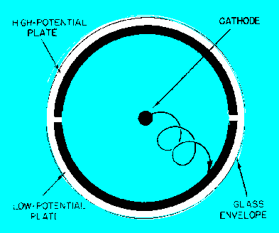 frequency. The negative-resistance magnetron is capable of greater power output than the basic magnetron. Its general construction is similar to the basic magnetron except that it has a split plate, as shown in figure 2-23. These half plates are operated at different potentials to provide an electron motion, as shown in figure 2-24. The electron leaving the cathode and progressing toward the high-potential plate is deflected by the magnetic field and follows the path shown in figure 2-24.">