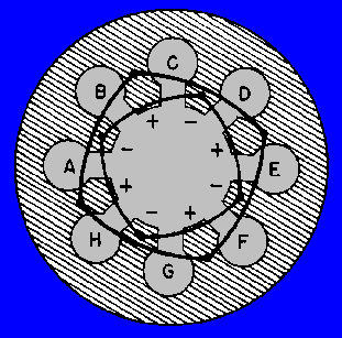 The anode block shown in figure 2-27, view (A), has cylindrical cavities and is called a HOLE-AND-SLOT ANODE. The anode block in view (B) is called the VANE ANODE which has trapezoidal cavities. The first two anode blocks operate in such a way that alternate segments must be connected, or strapped, so that each segment is opposite in polarity to the segment on either side, as shown in figure 2-28. This also requires an even number of cavities. Figure 2-28. - Strapping alternate segments.