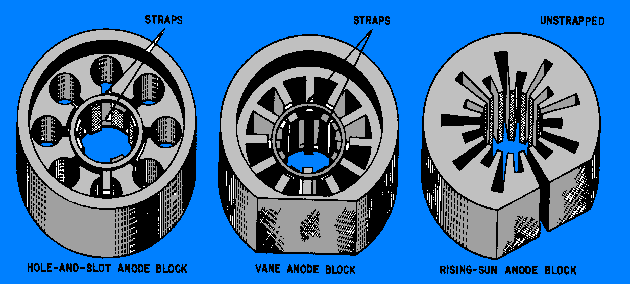 The electron-resonance magnetron is the most widely used for microwave frequencies because it has reasonably high efficiency and relatively high output. The average power of the electron-resonance magnetron is limited by the amount of cathode emission, and the peak power is limited by the maximum voltage rating of the tube components. Three common types of anode blocks used in electron-resonance magnetrons are shown in figure 2-27. Figure 2-27. - Common types of anode blocks.