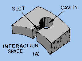 The anode block illustrated in figure 2-27, view (C), is called a RISING-SUN BLOCK. The alternate large and small trapezoidal cavities in this block result in a stable frequency between the resonant frequencies of the large and small cavities. Figure 2-29, view (A), shows the physical relationships of the resonant cavities contained in the hole-and-slot anode (figure 2-27, view (A)). This will be used when analyzing the operation of the electron-resonance magnetron. Figure 2-29A. - Equivalent circuit of a hole-and-slot cavity.
