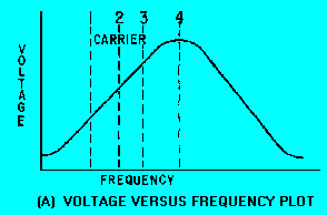 FM DEMODULATION In fm demodulators, the intelligence to be recovered is not in amplitude variations; it is in the variation of the instantaneous frequency of the carrier, either above or below the center frequency. The detecting device must be constructed so that its output amplitude will vary linearly according to the instantaneous frequency of the incoming signal. Several types of fm detectors have been developed and are in use, but in this section you will study three of the most common: (1) the phase-shift detector, (2) the ratio detector, and (3) the gated-beam detector. To be able to understand the principles of operation for fm detectors, you need to first study the simplest form of frequency-modulation detector, the SLOPE DETECTOR. The slope detector is essentially a tank circuit which is tuned to a frequency either slightly above or below the fm carrier frequency. View (A) of figure 3-9 is a plot of voltage versus frequency for a tank circuit. The resonant frequency of the tank is the frequency at point 4. Components are selected so that the resonant frequency is higher than the frequency of the fm carrier signal at point 2. The entire frequency deviation for the fm signal falls on the lower slope of the bandpass curve between points 1 and 3. As the fm signal is applied to the tank circuit in view (B), the output amplitude of the signal varies as its frequency swings closer to, or further from, the resonant frequency of the tank. Frequency variations will still be present in this waveform, but it will also develop amplitude variations, as shown in view (B). This is because of the response of the tank circuit as it varies with the input frequency. This signal is then applied to the diode detector in view (C) and the detected waveform is the output. This circuit has the major disadvantage that any amplitude variations in the rf waveform will pass through the tank circuit and be detected. This disadvantage can be eliminated by placing a limiter circuit before the tank input. (Limiter circuits were discussed in NEETS, Module 9, Introduction to Wave-Generation and Wave-Shaping Circuits.) This circuit is basically the same as an AM detector with the tank tuned to a higher or lower frequency than the received carrier. Figure 3-9A. - Slope detector. VOLTAGE VERSUS FREQUENCY PLOT