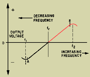 Q.21 What is the simplest form of fm detector? FOSTER-SEELEY DISCRIMINATOR The FOSTER-SEELEY DISCRIMINATOR is also known as the PHASE-SHIFT DISCRIMINATOR. It uses a double-tuned rf transformer to convert frequency variations in the received fm signal to amplitude variations. These amplitude variations are then rectified and filtered to provide a dc output voltage. This voltage varies in both amplitude and polarity as the input signal varies in frequency. A typical discriminator response curve is shown in figure 3-10. The output voltage is 0 when the input frequency is equal to the carrier frequency (fr). When the input frequency rises above the center frequency, the output increases in the positive direction. When the input frequency drops below the center frequency, the output increases in the negative direction. Figure 3-10. - Discriminator response curve.