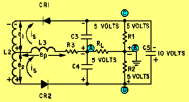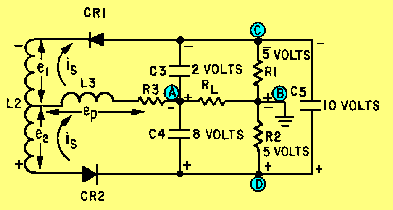 This circuit operates on the same principles of phase shifting as did the Foster-Seeley discriminator. In that discussion, vector diagrams were used to illustrate the voltage amplitudes and polarities for conditions at resonance, above resonance, and below resonance. The same vector diagrams apply to the ratio detector but will not be discussed here. Instead, you will study the resulting current flows and polarities on simplified schematic diagrams of the detector circuit. OPERATION AT RESONANCE. - When the input voltage ep is applied to the primary in figure 3-12 it also appears across L3 because, by inductive coupling, it is effectively connected in parallel with the primary tank circuit. At the same time, a voltage is induced in the secondary winding and causes current to flow around the secondary tank circuit. At resonance the tank acts like a resistive circuit; that is, the tank current is in phase with the primary voltage ep. The current flowing in the tank circuit causes voltages e1 and e2 to be developed in the secondary winding of T1. These voltages are of equal magnitude and of opposite polarity with respect to the center tap of the winding. Since the winding is inductive, the voltage drop across it is 90 degrees out of phase with the current through it. Figure 3-13 is a simplified schematic diagram of a ratio detector at resonance. The voltage applied to the cathode of CR1 is the vector sum of e1 and ep. Likewise, the voltage applied to the anode of CR2 is the vector sum of e2 and ep. No phase shift occurs at resonance and both voltages are equal. Both diodes conduct equally. This equal current flow causes the same voltage drop across both R1 and R2. C3 and C4 will charge to equal voltages with opposite polarities. Let's assume that the voltages across C3 and C4 are equal in amplitude (5 volts) and of opposite polarity and the total charge across C5 is 10 volts. R1 and R2 will each have 5 volts dropped across them because they are of equal values. The output is taken between points A and B. To find the output voltage, you algebraically add the voltages between points A and B (loop ACB or ADB). Point A to point D is -5 volts. Point D to point B is + 5 volts. Their algebraic sum is 0 volts and the output voltage is 0 at resonance. If the voltages on branch ACB were figured, the same output would be found because the circuit branches are in parallel. Figure 3-13. - Current flow and polarities at resonance.