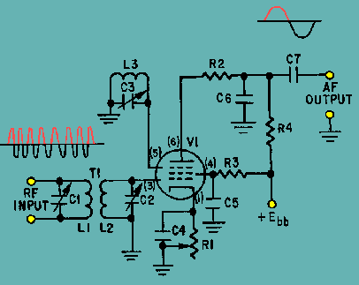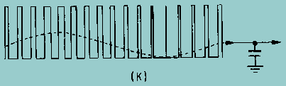 View (K) shows the resultant plate-current pulses when an fm signal is applied to a gated-beam detector. Plate load resistor R4 and capacitor C6 form an integrating network which filters these pulses to form the sine-wave output. Figure 3-18K. - Gated-beam detector waveforms.