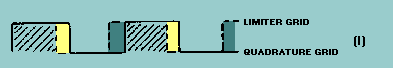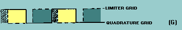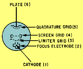 Circuit Operation The gated-beam detector employs a specially designed gated-beam tube. The elements of this tube are shown in figure 3-17. The focus electrode forms a shield around the tube cathode except for a narrow slot through which the electron beam flows. The beam of electrons flows toward the limiter grid which acts like a gate. When the gate is open, the electron beam flows through to the next grid. When closed, the gate completely stops the beam. Figure 3-17. - Gated-beam tube physical layout.