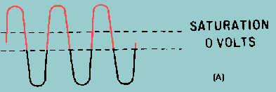 After the electron beam passes the limiter grid, the screen grid refocuses the beam toward the quadrature grid. The quadrature grid acts much the same as the limiter grid; it either opens or closes the passage for electrons. These two grids act similar to an AND gate in digital devices; both gates must be open for the passage of electrons to the plate. Either grid can cut off plate current. AND gates were presented in NEETS, Module 13, Introduction to Number Systems, Boolean Algebra, and Logic Circuits. Look again at the circuit in figure 3-16. With no signal applied to the limiter grid (3), the tube conducts. The electron beam moving near the quadrature grid (5) induces a current into the grid which develops a voltage across the high-Q tank circuit (L3 and C3). C3 charges until it becomes sufficiently negative to cut off the current flow. L3 tends to keep the current moving and, as its field collapses, discharges C3. When C3 discharges sufficiently, the quadrature grid becomes positive, grid current flows, and the cycle repeats itself. This tank circuit (L3 and C3) is tuned to the center frequency of the received fm signal so that it will oscillate at that frequency. The waveforms for the circuit are shown in figure 3-18. View (A) is the fm input signal. The limiter-grid gate action creates a wave shape like view (B) because the tube is either cut off or saturated very quickly by the input wave. Note that this is a square wave and is the current waveform passing the limiter grid. Figure 3-18A. - Gated-beam detector waveforms.