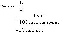 Keep in mind that the D'Arsonval meter movement uses current flow to produce a magnetic field that is proportional to the current. The meter movement is, therefore, an indicator of current flow rather than voltage. The addition of the series resistance is what allows the meter to be calibrated in terms of voltage; that is, the meter movement of a voltmeter operates because of the current flow through the meter, but the scale is marked in volts. For example, the meter movement shown in figure 3-9 has an internal resistance of 100 ohms, requires 100 microamperes for full-scale deflection, and has a voltage drop of 10 millivolts when full-scale deflection is reached. If you were to place this meter directly across a 10-volt source, an excessive current (in milliamperes) would flow. The meter would be destroyed because of the excessive current flowing through the meter movement. This can be seen in the following Ohm's law application: Figure 3-9. - Use of multiplier resistors with D'Arsonval meter movement.
