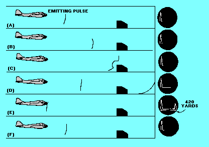 The frequency regularly changes 40 megahertz with respect to time; therefore, its value at any time during its cycle can be used as the basis for computing the time elapsed after the start of the frequency cycle. For example, at T0 the transmitter sends a 420-megahertz signal toward an object. It strikes the object and returns to the receiver at T1, when the transmitter is sending out a new frequency of 440 megahertz. At T1, the 420-megahertz returned signal and the 440-megahertz transmitter signal are fed to the receiver simultaneously. When the two signals are mixed in the receiver, a beat frequency results. The beat frequency varies directly with the distance to the object, increasing as the distance increases. Using this information, you can calibrate a device that measures frequency to indicate range. This system works well when the detected object is stationary. It is used in aircraft altimeters which give a continuous reading of the height above the earth of the aircraft. The system is not satisfactory for locating moving objects. This is because moving targets produce a frequency shift in the returned signal because of the Doppler effect; this affects the accuracy of the range measurement. PULSE-MODULATION METHOD The pulse-modulation method of energy transmission was analyzed to some extent earlier in this chapter. As the previous discussions indicated, radio-frequency energy can also be transmitted in very short bursts, called pulses. These pulses are of extremely short time duration, usually on the order of 0.1 microsecond to approximately 50 microseconds. In this method, the transmitter is turned on for a very short time and the pulse of radio-frequency energy is transmitted, as shown in view A of figure 1-22. The transmitter is then turned off, and the pulse travels outward from the transmitter at the velocity of light (view B). When the pulse strikes an object (view C), it is reflected and begins to travel back toward the radar system, still moving at the same velocity (view D). The pulse is then received by the radar system (view E). The time interval between transmission and reception is computed and converted into a visual indication of range in miles or yards. The radar cycle then starts over again by transmitting another pulse (view F). This method does not depend on the relative frequency of the returned signal or on the motion of the target; therefore, it has an important advantage over cw and fm methods. Figure 1-22. - Pulse detection.